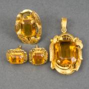 18kt gouden demi parure, bestaande uit: ring, mt. 16, hanger en oorstekers, alle met tafelgeslepen citrien, omgeven door voluten gedecoreerde omlijsting, brutogewicht 19,5 gram