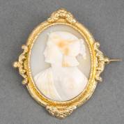 18kt gouden cameebroche met beeltenis van Selena, in gedecoreerde ovale lijst, brutogewicht 19,2 gram, 6 x 5 cm