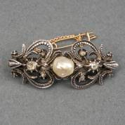 18kt gouden en 1e gehalte zilveren broche, bezet met twee roosdiamanten en één barokparel, veiligheidsketting en speld, brutogewicht 6,7 gram, 1,75 x 4 cm