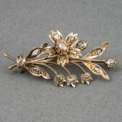 14kt gouden takbroche, bezet met roosdiamant, de bloem is draaibaar, brutogewicht 6,1 gram, 2,25 x 4,5 cm