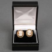 Paar BWGG oorstekers, bezet met een schelpcamee, brutogewicht 3,1 gram, gekeurd 9kt, in doosje, 1,5 x 1 cm