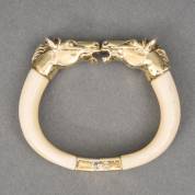 Ivoren klemarmband, de uiteinden gedecoreerd met vergulde 1e gehalte zilveren paardenhoofden, circa 1900, brutogewicht 64,8 gram, 7,5 x 6 cm