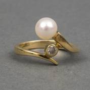 14kt gouden slagring bezet met gecultiveerde parel en briljantgeslepen diamant, circa 0.10ct, mt. 16,75, brutogewicht 3,9 gram