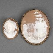 Twee BWGG schelpcameebroches, één met godin Selene, gekeurd 9kt, circa 1900, de ander met dorpstafereel en onedele speld, brutogewicht 18,7 gram, 5,5 x 4,5, 3 x 2,5 cm