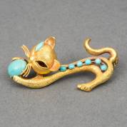 18kt gouden broche in de vorm van een poes, bezet met turkoois, brutogewicht 8,4 gram -één turkoois oog mist-, 4,5 x 2,25 cm