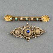 Twee BWGG broches, één bezet met pareltjes en turkoois, ander met lapis lazuli, brutogewicht 8,4 gram
