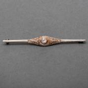 18kt witgouden brochette, bezet met briljantgeslepen diamant, omgeven door filligrainwerk, brutogewicht 3,6 gram, 6 cm