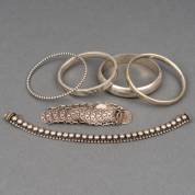 Zes zilveren armbanden, diverse gehaltes: drie stijve armbanden, één rinkelband met bollen, een muntenarmband, en een schakelarmband, gewicht 122 gram