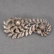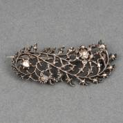 Samengestelde zilverkleurige verenbroche, bezet met roosdiamant, brutogewicht 9,8 gram, 5 x 2 cm