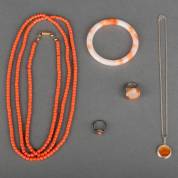 Rood kunststof kralencollier aan 14kt gouden tonsluiting, 2e gehalte zilveren ring met bloedkoraal en markasiet, chalcedoon armband en 2e gehalte zilveren hanger, collier en ring met agaat, brutogewicht 122 gram