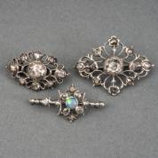 Twee ruitvormige opengewerkte broches bezet met roosdiamant, daarbij: een 2e gehalte zilveren broche bezet met cabochongeslepen opaal en negen roosdiamantjes, brutogewicht 14,6 gram