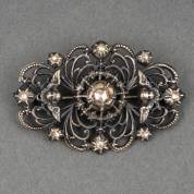 2e gehalte zilveren opengewerkte broche bezet met negen roosdiamanten, gedecoreerd met mascarons, brutogewicht 15,2 gram,, 3,5 x 5,25 cm