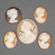 Vijf schelpcamees met vrouwportret, waaronder: godin Selene, 3,5 cm