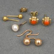 Paar 14kt gouden oorstekers, bezet met cabochongeslepen bloedkoraal, paar 14kt gouden bolvormige oorstekers, paar bolvormige 14kt roségouden oorhangers en losse 14kt gouden oorsteker met zoetwaterpareltje, brutogewicht 3,6 gram -slechts twee poussettes-, Ø ,75 cm