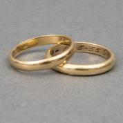 Paar 14kt gouden bandringen met gravering, beide mt. 18,5, gewicht 6,6 gram