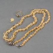14kt gouden slagring met twee oud slijpsel diamantjes, centrale parel missend, daarbij 14kt gouden bedeltje met Madonna met kind, en gefacetteerd kralencollier, aan 1e gehalte zilveren tonslot, brutogewicht bedel en ring 2,8 gram -één diamant gechipt-