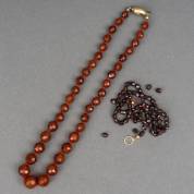 Kornalijnen collier met gefacetteerde kralen en 14kt gouden sluiting, daarbij: granatencollier -gebroken- aan 14kt gouden kapittelslotje