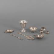 Divers klein zilver, waaronder: theezeefje met lekbakje, asbakje en zuurvork, diverse gehaltes -enkele deukjes-, brutogewicht 339 gram