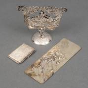 1e gehalte zilveren briefstandaard, gedecoreerd met voluten en putti, en 3e gehalte zilveren jugendstil applique gedecoreerd met narcissen, gemonogrammeerd: 'EL', daarbij: geribd zilveren postzegeldoosje met vermeil binnenzijde, brutogewicht 88,6 gram -briefhouder defect-, 8 cm