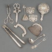 Divers klein zilver, diverse gehaltes, waaronder: notenkraker met 2e gehalte zilveren greep, en een maliënbeursje, brutogewicht 405 gram, daarbij: onedele druivenschaar, 17 cm