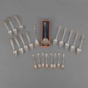 Zes 2e gehalte zilveren gegraveerde theelepels, vijf 2e gehalte zilveren theelepels, rondfilet, daarbij: acht 2e gehalte zilveren mokkalepeltjes met bloemgedecoreerde stelen, en twee 2e gehalte zilveren suikerlepels, gewicht 205 gram