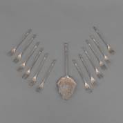 Twaalf 2e gehalte zilveren taartvorkjes en een taartschep, alle met gekroonde steel, meester: J. Niekerk, Schoonhoven, circa 1970, gewicht 216 gram