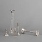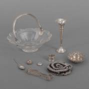 Twee 1e gehalte zilveren anjervazen, 1e gehalte zilveren geprofileerde tafelkandelaar, geslepen kristallen karaf, 3e gehalte zilveren knottenmandje, daarbij: drie theelepels en drie suikerschepjes, diverse gehaltes, brutogewicht 959 gram -grote anjervaas defect, karaf mist stop-