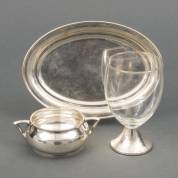 Ovaal 2e gehalte zilveren serveerschaaltje en 2e gehalte zilveren suikerschaal met twee strak vormgegeven oren, beide meester: Gerritsen en Van Kempen, Zeist, 1931, daarbij: glas op 1e gehalte zilveren voet, brutogewicht 321 gram -suikerschaal heeft deuk-, 20,25 x 14,25 cm