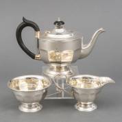 Driedelig 1e gehalte zilveren theeservies, meester: Edward Viner, Sheffield, 1931, brutogewicht 693 gram -theepot en roomkan klein deukje-, 13 x Ø 15,5 cm