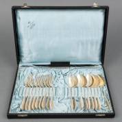 Negen 2e gehalte zilveren dessertcouverts, puntfilet, gemonogrammeerd: 'R', meesters: Zilverfabriek Voorschoten en Gerritsen en van Kempen, Zeist, circa 1930, gewicht 744 gram, in cassette, 17,5 cm
