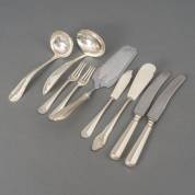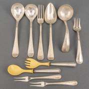 Paar 2e gehalte zilveren zuurvorkjes, meester: H. Hooijkaas, Schoonhoven, 1929, 2e gehalte zilveren botermesje, twee 2e gehalte zilveren sauslepels, twee 2e gehalte zilveren tafelmessen, Haags lofje, gegraveerde taartschep met 2e gehalte zilveren heft, puntfilet, en 3e gehalte zilveren vismes, brutogewicht 540 gram