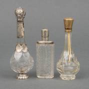 Drie kristallen parfumflacons, één met 14kt gouden montuur en dop, twee met 2e gehalte zilveren montuur en dop, brutogewicht 158 gram -gebruikssporen-, 12,5 cm