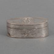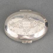 Ovaal 2e gehalte zilveren pepermuntdoosje met fijn gegraveerd decor, gemonogrammeerd: 'H.H.J'.', 1875, gewicht 23 gram -gebruikssporen-, 1,75 x 5,75 x 4,5 cm
