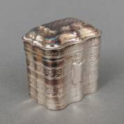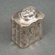 Gecontourneerd 2e gehalte zilveren lodereindoosje met geciseleerd en gegraveerd banendecor, gemonogrammeerd cartouche: 'E L', eerste helft 19e eeuw, gewicht 13 gram -deukjes in deksel-, 3,75 x 3 x 2,25 cm