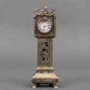 2e gehalte zilveren miniatuur: staand horloge, de kap bekroond door cherubijnen en ornament van Maria, voorzien van geëmailleerde wijzerplaat, meester: J. Verhoogt, Hoorn, 1909 -doorpoetst, intern zakhorloge vastgesoldeerd, wijzerplaat met defecten, onedele klep aan achterzijde van later datum-, 22,5 cm