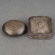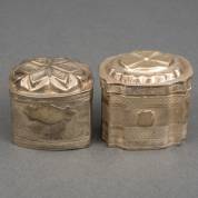Twee 2e gehalte zilveren lodereindoosjes, geribd, met gegraveerd decor en cartouche, gewicht 38 gram -het afgeronde exemplaar met defecten-, 4 x 4,5 x 3,25 cm