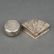 Twee 3e gehalte zilveren pepermuntdoosjes met vermeil binnenzijde, één waaiermodel met decor van vrouwen en rocailles, de ander rond met bloemdecor, beide Duitsland, gewicht 53 gram, 1,5 x 6 x 4,25 cm
