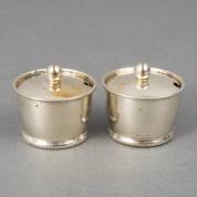 Paar 3e gehalte zilveren peper- en zoutvaatjes met glazen binnenbakje en deksel, 3 x Ø 3,5 cm
