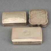 Gecontourneerd 2e gehalte zilveren pepermuntdoosje, en twee 2e gehalte zilveren snuifdoosjes, gewicht 115 gram, 1,5 x 7,25 x 4,25 cm