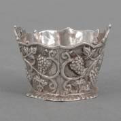 1e gehalte zilveren mandje met geciseleerd decor van druivenranken en bloemenvaas, meester: Edwin Thomson Bryant, Londen, 1891, gewicht 36 gram, onderzijde ook voorzien van Nederlandse keuren, 3,5 x 5 x 4,5 cm