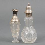Kristallen parfumflacon met 2e gehalte zilveren dop -deukje in het deksel-, en kristallen peperstrooier met 2e gehalte strooidop, brutogewicht 153 gram, 13 cm