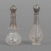 Twee kristallen odeurflacons met 2e gehalte zilveren montuur en dop, binnenstopjes aanwezig, brutogewicht 122 gram, 11 cm