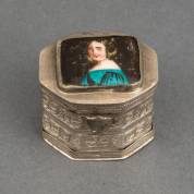 2e gehalte zilveren lodereindoosje met dubbele bodem, gedecoreerd met portret van een vrouw geschilderd op porselein, 1850, brutogewicht 31 gram, 3,75 x 4 x 3,25 cm