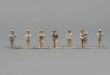 Zeven 3e gehalte zilveren muzikanten, alle op drie bolpootjes, Duitsland, Neurenberg, 19e eeuw, gewicht 479 gram, 9 cm