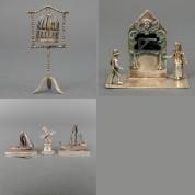 Vijf 2e gehalte zilveren miniaturen: zeilschip 'De Eendracht 1676', zeilschip 'De Eendracht 1976', molen, poppenkast, en vogelkooi, gewicht 145 gram