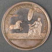 Zilveren penning: 'Het verbond met Frankrijk gevierd te Rotterdam', voorzijde: Nederlandse maagd door Frans schild beschermd tegen Engelse eenhoorn en Oostenrijkse adelaar, keerzijde: Mercurius hangt twee wapenschilden aan een zuil, door: J. van Baerll Adz., 1786