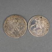 Twee zilveren munten: Bourgondische rijksdaalder Brabant 1567, en zilveren rijder 1769 met gat, gewicht 45 gram