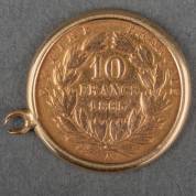 Gouden 10-Franc munt, 1865, in montuur, gewicht 4,0 gram -oogje hanger gebroken-