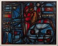 Duitse School: echtpaar bij auto, olieverf op board, gesigneerd R Klaus, futurisme, circa 1960, 46,5 x 59 cm