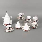 Wit porseleinen koffieservies met zwart decor, 'HoYng', uitvoering J. Kronester, West-Duitsland, Memphis-stijl, bestaande uit: koffiepot, acht kop-en-schotels, roomkan en suikerpot,, 26,5 x Ø 17 cm